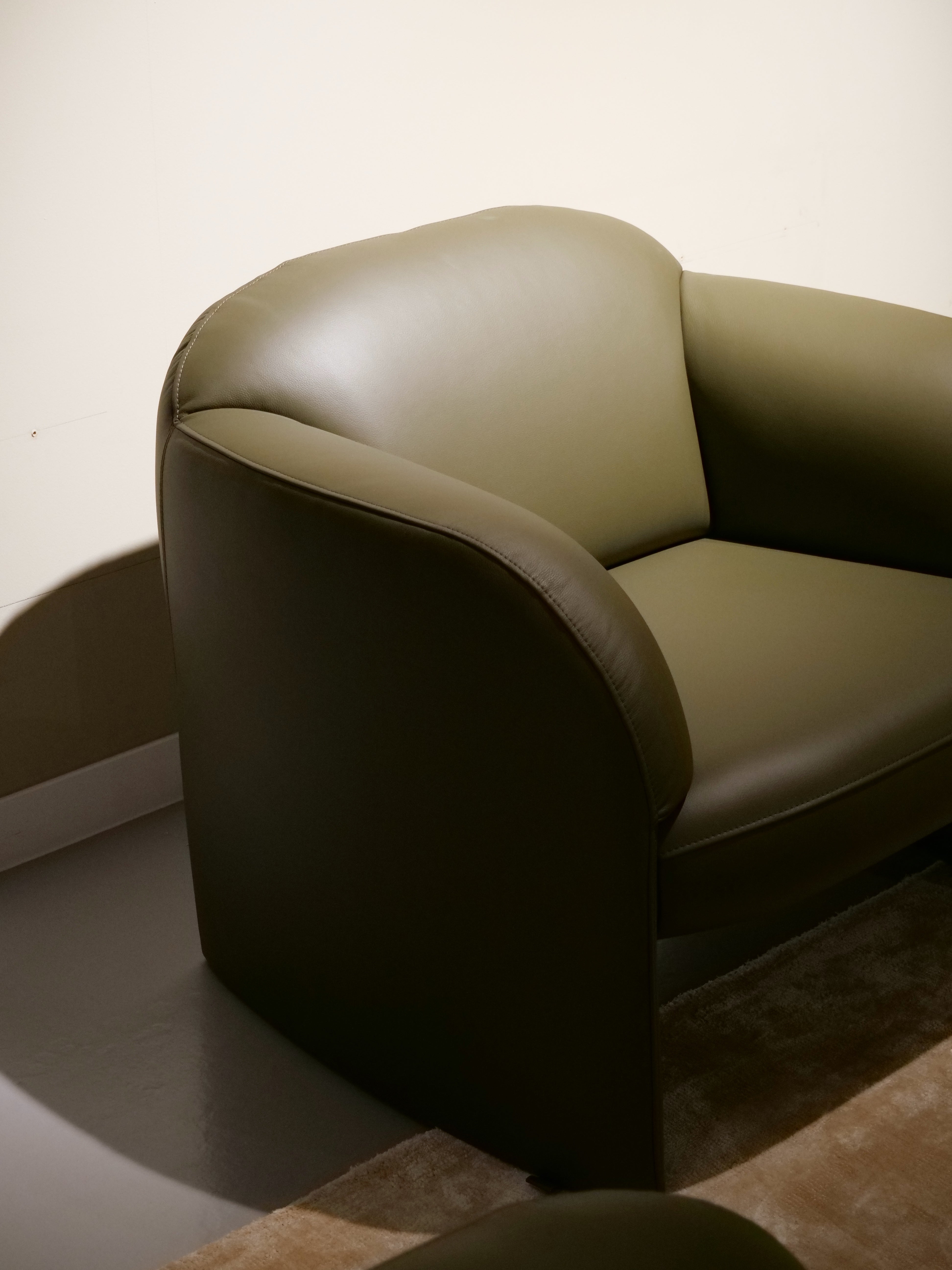 Wat de Modius fauteuil uniek maakt, is de balans tussen rechte en gebogen lijnen. De rechte contouren van de zitting en rugleuning worden harmonieus gecombineerd met zachte, ronde armleuningen, waardoor een elegant stoffeerdetail ontstaat op de plek waar rug en arm samenkomen. Dit detail getuigt van de uitzonderlijke vakmanschap van Leolux-stoffeerders, die in staat zijn om deze complexe vormgeving perfect uit te voeren. Het resultaat is een strakke fauteuil met een organische, uitnodigende uitstraling.
